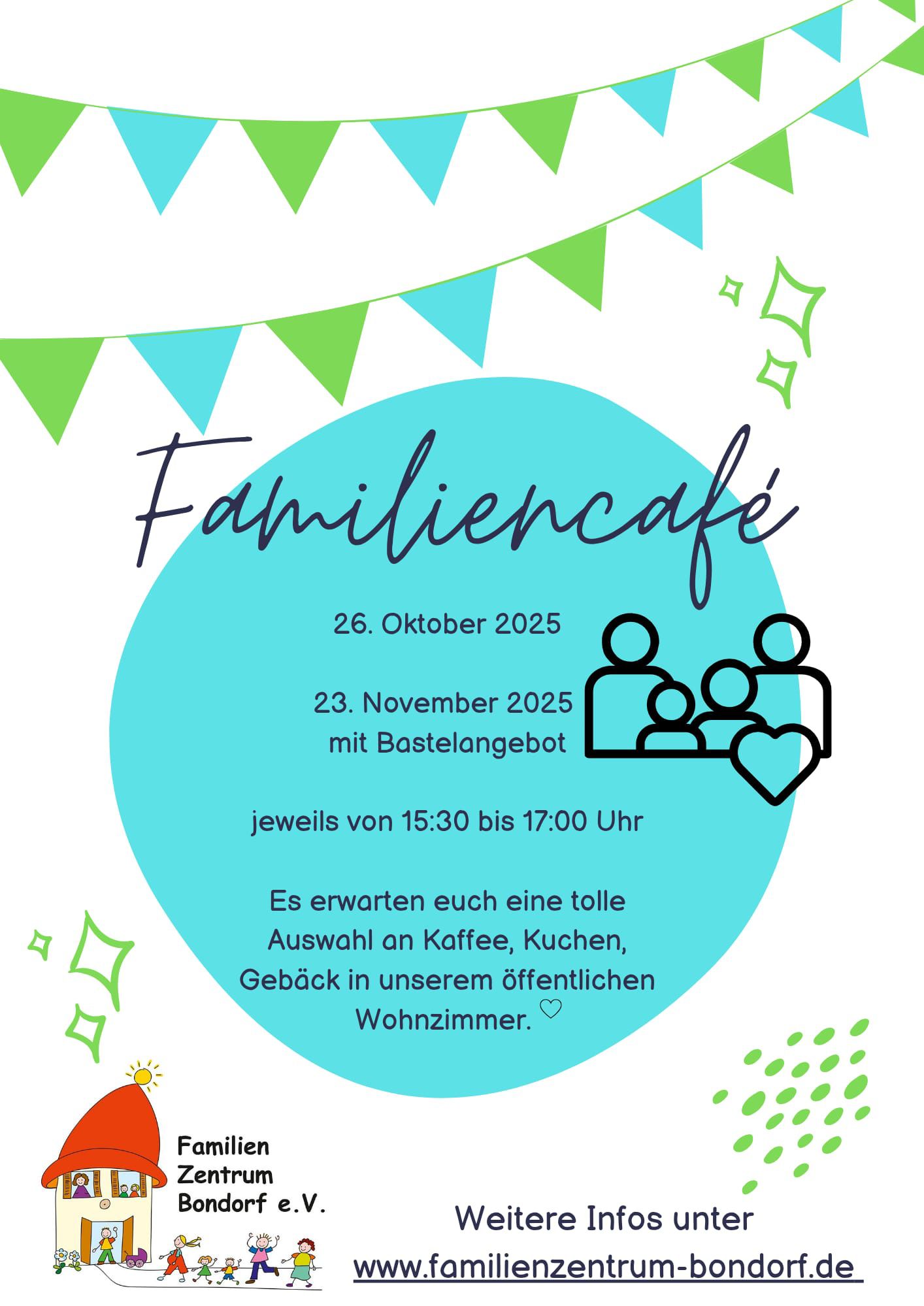 Sonntag, 26. Oktober 2025 - 15:30 bis 17:00Herzlich willkommen in unserem Familiencafé! Gastgeber:innen: Christine und Martin Bernhardt, Hannah und Johannes Wendang Keine Anmeldung erforderlich. Auch Nicht-Mitglieder sind herzlich willkommen.